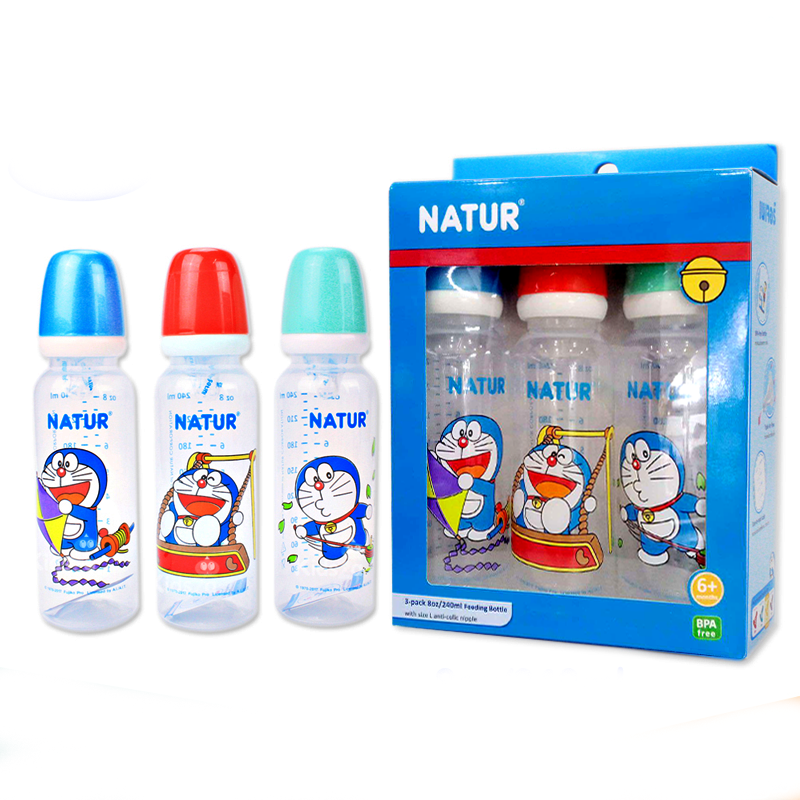 Natur Doraemon Pattern Feeding Bottle Round Shape BPA Free With Anti Colic Nipple Size 8oz for baby 6months ++